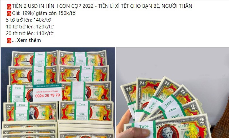 Trên chợ mạng, tiền in hình con hổ được rao bán với nhiều mẫu mã và mức giá đa dạng. Chẳng hạn như, tờ tiền 2 USD in hình con hổ 2022 có giá dao động từ 150.000 - 199.000 đồng/tờ. Nếu khách mua 5 tờ trở lên, mức giá là 140.000 đồng/tờ; mua từ 10 tờ trở lên giá sẽ thấp hơn còn 120.000 đồng/tờ.