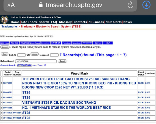 Qua kiểm tra ban đầu, có 5 hồ sơ đăng ký về bảo hộ nhãn hiệu thương mại cho gạo ST25 tại Mỹ và đang chờ xử lý. Nếu thời gian tới, DN sở hữu thương hiệu gạo này không có động thái kịp thời, khiếu nại với cơ quan cấp đăng ký nhãn hiệu của Mỹ thì có thể thương hiệu này sẽ mất.