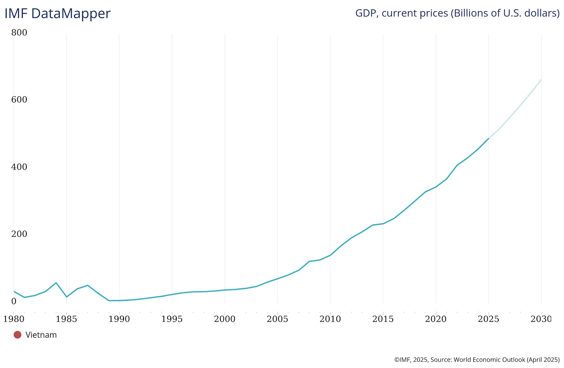 IMF dự báo, quy mô kinh tế của Việt Nam năm 2025 ước đạt 491 tỷ USD, xếp thứ 34 trên thế giới và xếp thứ 5 trong khu vực Đông Nam Á, sau Indonesia (1,3 tỷ USD), Singapore (564,7 triệu USD), Thái Lan (546,2 triệu USD) và Philippines (497,5 triệu USD).