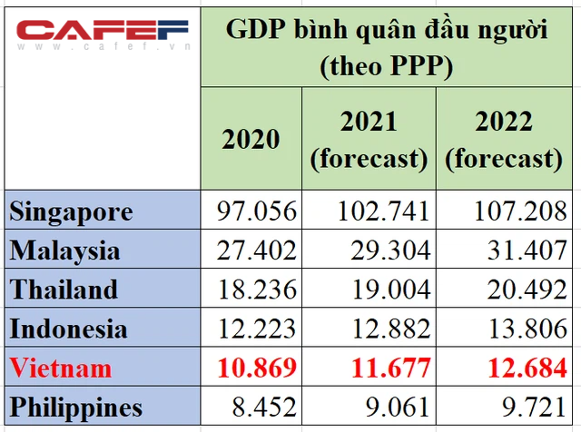 Mặt khác, đến năm 2020, GDP theo ngang giá sức mua của Việt Nam đã vượt qua mức 10.000 USD, đạt 10.869 USD/người/năm. Theo dự báo, đến năm 2021, con số này sẽ đạt 11.677 USD và đến 2022 thì vượt qua 12.000 USD. Tuy nhiên, mức tăng này vẫn chưa đủ mạnh để Việt Nam có thể thăng hạng trong nhóm ASEAN-6 mà chỉ xếp trên Philippines, vẫn đứng sau Singapore, Malaysia, Indonesia và Thái Lan.