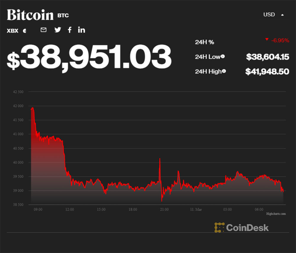 Giá Bitcoin vào hôm nay (11/3), bất ngờ giảm mạnh, mất mốc 40.000 USD/đồng và xóa sạch mức tăng trong ngày trước đó.