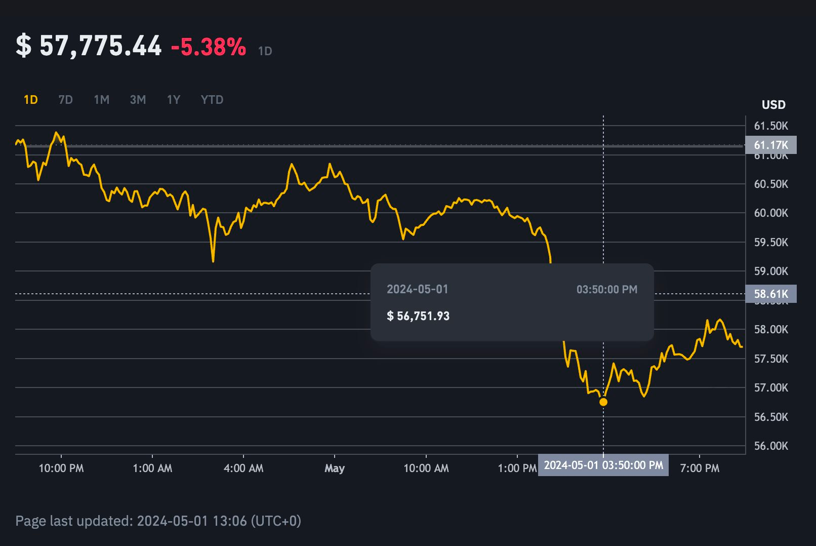 02/05/2024 21:17Giá Bitcoin lao dốc trước thềm cuộc họp của FED, có lúc thủng 57.000 USD/coin