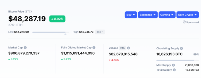 Theo dữ liệu từ CoinMarketCap, đồng tiền kỹ thuật số có giá trị nhất thế giới vừa lên mức kỷ lục hơn 48.000 USD, nâng giá trị vốn hóa lên hơn 900 tỷ USD. Nếu tính vốn hóa trên tổng số 21 triệu đồng Bitcoin, quy mô của đồng tiền kỹ thuật số này đã vượt ngưỡng 1.000 tỷ USD.