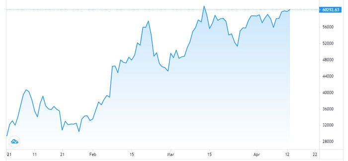 Theo hãng tin Bloomberg, giá Bitcoin có lúc tăng 2,6%, đạt 61.229 USD, cao nhất trong gần 1 tháng. Hôm 13/3, giá đồng tiền kỹ thuật số lớn nhất thế giới này đạt kỷ lục 61.742 USD. Trong vòng 1 năm qua, giá Bitcoin tăng gấp khoảng 9 lần, một mức lợi nhuận vượt xa tất cả những kênh đầu tư truyền thống như ổ phiếu hay vàng.