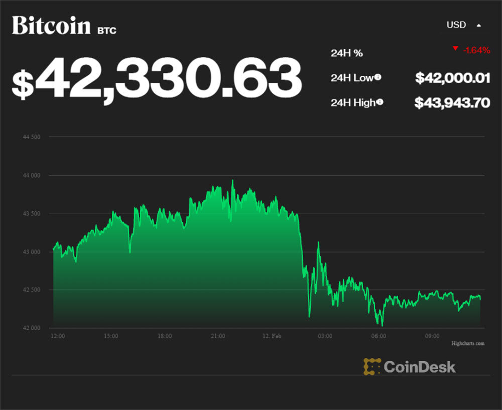 Tuy nhiên, từ hôm qua đến nay, giá Bicoin đã quay đầu giảm mạnh, về ngưỡng 42.000 USD.