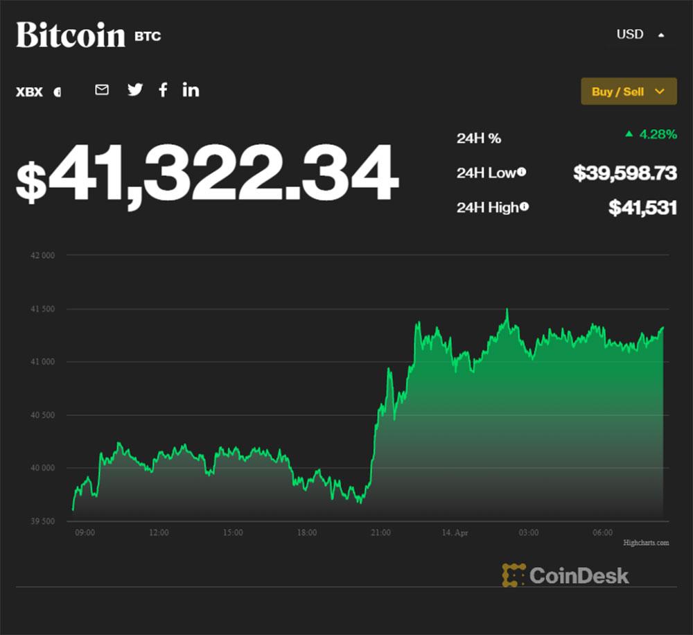 Vào tối qua (13/4), giá Bitcoin bất ngờ bật tăng sau một tuần giảm giá, xuống mức 39.000 USD. Tới sáng nay (14/4), giá Bitcoin tiếp tục tăng, vọt lên trên ngưỡng 41.000 USD.