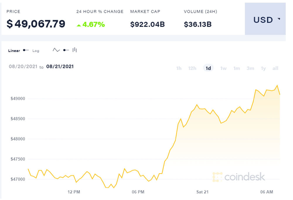 Giá Bitcoin mấy ngày hôm nay biến động dữ dội. Vào ngày 19/8, giá Bitcoin đã lao dốc xuống dưới 44.000 USD/đồng. Đến ngày hôm qua (18/8), giá Bitcoin tăng lên mức 47.000 USD. Đêm qua, giá Bitcoin được giao dịch quanh ngưỡng 49.000 USD. Đến sáng hôm nay, giá Bitcoin ở mức hơn 49.000.000 USD.