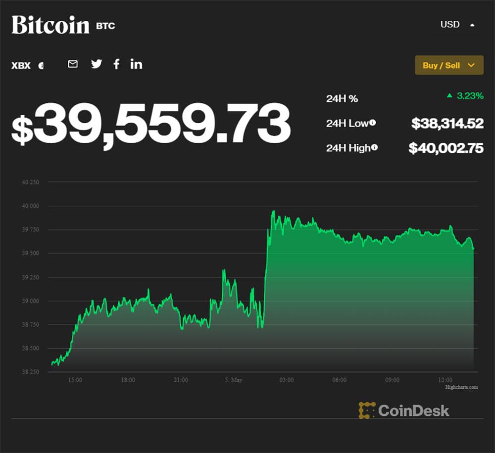 Trong 24h qua, giá Bitcoin biến động rất mạnh. Vào hôm qua, giá Bitcoin đã giảm mạnh, có thời điểm về mốc 37.000 USD. Nhưng tới hôm nay (5/5), giá Bitcoin bất ngờ tăng trở lại, có lúc đã vượt ngưỡng 40.000 USD.