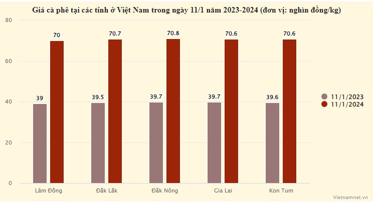 Theo đó, giá cà phê phá đỉnh lịch sử 70.000 đồng/kg hồi tháng 7 năm 2023. Cụ thể, ngày 11/1, giá loại hạt này tại tỉnh Lâm Đồng, Đắk Lắk, Đắk Nông, Gia Lai, Kon Tum tăng lên ngưỡng 70.000-71.000 đồng/kg.
