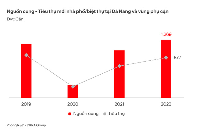 Nguồn cung mới nhà phố, biệt thự khu vực Đà Nẵng và vùng phụ cận ghi nhận tăng so với năm 2021. Trong năm 2022, thị trường đón nhận 1.269 căn nhà phố, biệt thự đến từ 10 dự án, tăng 22% so với năm ngoái. Tuy nhiên chỉ tập trung cục bộ tại một số dự án quy mô lớn trong khu vực và phân bổ chủ yếu trong giai đoạn 6 tháng đầu năm. Tỷ lệ tiêu thụ đạt 69% tương đương 877 căn, tăng 27% so với năm 2021. Mặt bằng giá sơ cấp tiếp tục duy trì đà tăng, dao động từ 18 - 20% so với cùng kỳ do chi phí đầu vào, lạm phát, lãi suất tăng cao. Ở thị trường thứ cấp, thanh khoản ở mức thấp và gần như không phát sinh giao dịch.