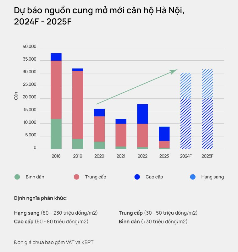 Tại Hà Nội, nguồn cung cả năm 2024 dự kiến đạt gần 30.000 căn, gần tương đương năm 2019 - thời kỳ trước Covid và cao hơn giai đoạn 2020 - 2023; đặc biệt cao hơn so với dự báo trước đó (là 22.000 - 24.000 căn). Theo đó, căn hộ phân khúc cao cấp và hạng sang tiếp tục chiếm chủ yếu nguồn cung trong cuối năm 2024 và 2025.