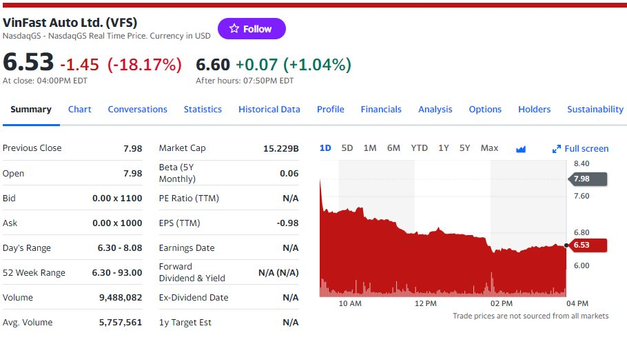 Ngay từ đầu phiên giao dịch ngày 16/10, cổ phiếu VFS của VinFast đã ngay lập tức giảm trên 10%, xuống dưới mức 7 USD/cp. Chốt phiên VFS giảm 18% xuống còn 6,53 USD.