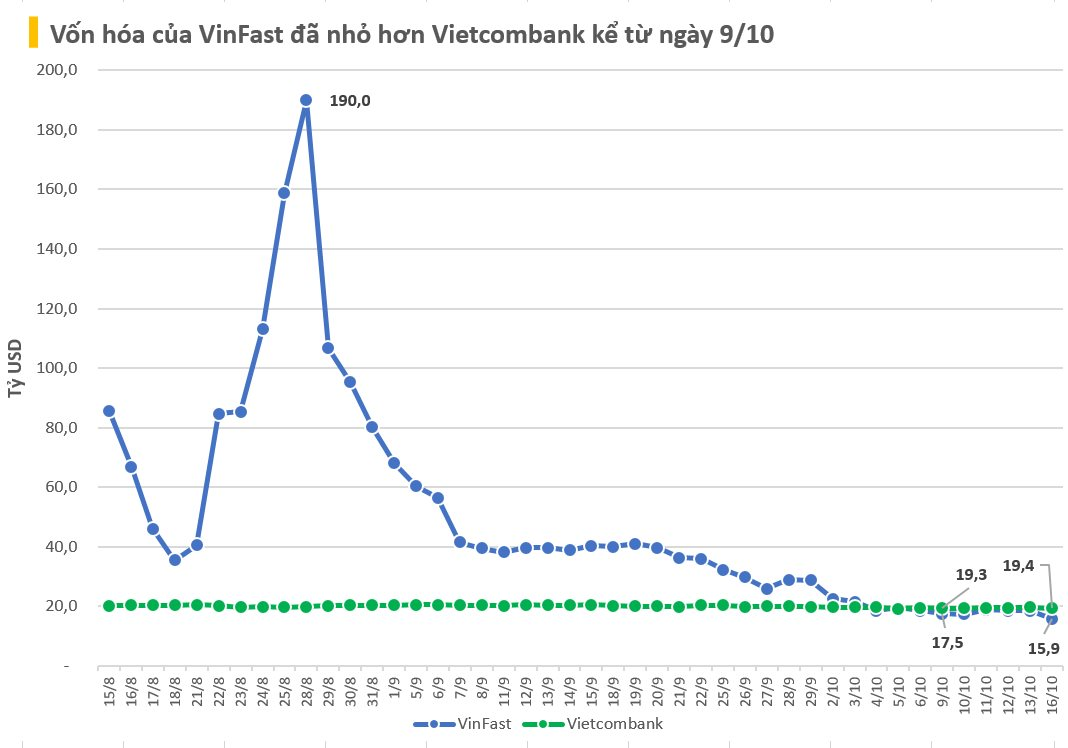 Trong nước, vốn hóa của VinFast hiện cũng đang nhỏ hơn Vietcombank (mã chứng khoán: VCB). Vốn hóa của hãng xe điện này đã thấp hơn Vietcombank kể từ ngày đầu tuần trước cho tới nay. Trước đó, đã có lúc vốn hóa VinFast còn gấp 2,2 lần các doanh nghiệp có giá trị lớn nhất trên sàn chứng khoán Việt Nam cộng lại.