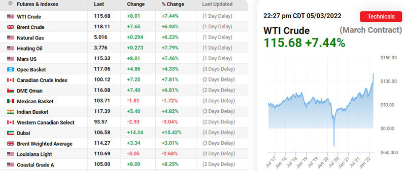 Trên tờ FT, Scott Sheffield, CEO công ty khai thác dầu đá phiến lớn nhất Mỹ Pioneer Natural Resources, cho rằng, giá dầu WTI sẽ tăng từ mức 110 USD/thùng hiện nay lên 200 USD/thùng nếu phương Tây cấm dầu và khí đốt của Nga. Một năm qua, giá dầu đã tăng gần gấp đôi.