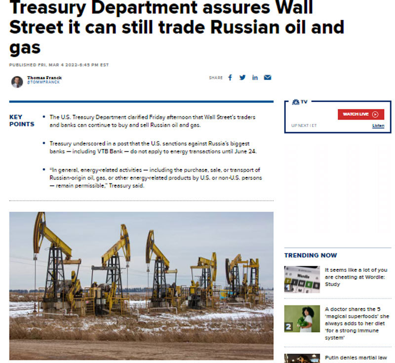 Theo CNBC, mặc dù phương Tây đang dồn dập trừng phạt Nga nhưng Bộ Tài chính Mỹ cho rằng các tay buôn và ngân hàng phố Wall Street vẫn có thể mua và bán dầu và khí của Nga bình thường. Mỹ ra lệnh trừng phạt lên các ngân hàng lớn nhất của Nga, trong đó có Ngân hàng VTB Bank, nhưng không áp dụng đối với các giao dịch trong lĩnh vực năng lượng cho đến 24/6.