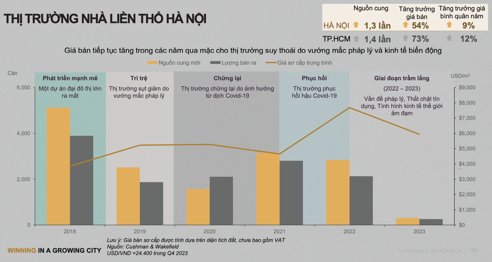 Riêng thị trường Hà Nội, trong 10 năm qua, nguồn cung căn hộ đã tăng 2,8 lần, còn giá bán tăng 109%, tăng trưởng giá bình quân đạt 9%/năm. Trong khi đó, 5 năm qua, phân khúc nhà liền thổ chứng kiến nguồn cung tăng 1,3 lần, giá bán tăng 54%.