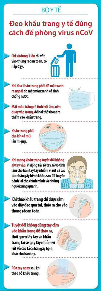 Để bảo vệ bản thân khỏi dịch bệnh do virus corona nCoV, Bộ Y tế khuyên người dân đeo khẩu trang khi đi đến chỗ đông người hoặc khi tiếp xúc với người có triệu chứng bệnh.