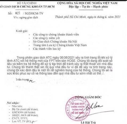 Công văn được ông Minh giả mạo cho rằng trong phiên giao dịch ATC ngày 6-6 đã xảy ra tình trạng bị lỗi khi xử lý lệnh ATC với hệ thống mới của FPT trên HOSE. "Chúng tôi đang đối soát số liệu và kiểm tra hệ thống để xử lý kịp thời, tránh xảy ra thất thoát với nhà đầu tư. Chúng tôi thành thật xin lỗi quý nhà đầu tư vì đã để xảy ra tình trạng này. Chúng tôi xác định đây là một lỗi rất nghiêm trọng của hệ thống. Chúng tôi sẽ ra sức khắc phục sự cố và thông báo đến quý nhà đầu tư sớm nhất có thể" - văn bản giả mạo nêu.