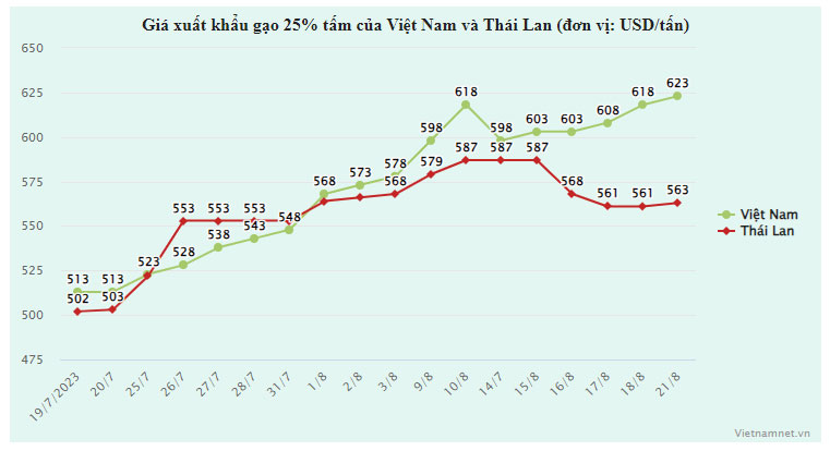 Đến ngày 21/8, giá mặt hàng này của nước ta vọt lên mức 623 USD/tấn, tăng 110 USD/tấn so với phiên 19/7. Đáng chú ý, suốt một tháng qua, giá xuất khẩu loại gạo 25% tấm của Việt Nam chỉ có 1 phiên duy nhất giảm, còn lại tăng không ngừng nghỉ.