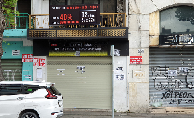 Tại quận 1, trên trục đường Đồng Khởi, một trong 3 tuyến phố có giá đất đắt nhất Sài Gòn (theo công bố của bảng giá đất), không khó tìm thấy những dãy nhà mặt tiền đóng cửa, dán chi chít số điện thoại liên hệ bán hoặc cho thuê, có nơi còn in hẳn dòng chữ giảm giá thuê 40%.