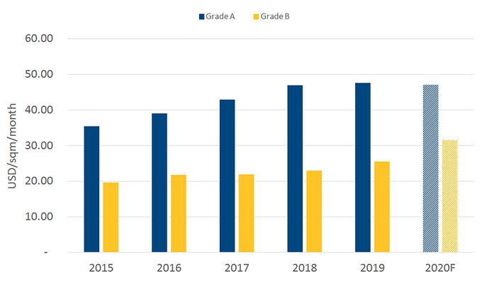 Theo đó, khoảng giá cho thuê thuần của các tòa nhà hạng B tại TP HCM rất rộng, trải dài từ khoảng 10-48 USD trên mỗi m2 mỗi tháng tính đến quý III/2020.