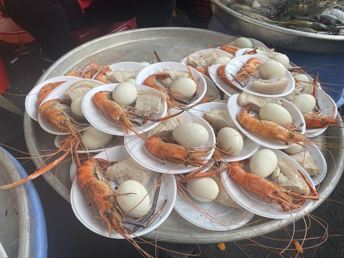 Tôm càng xanh được nhiều người mua để đặt trong bộ tam sên gồm trứng, thịt luộc để cúng Thần Tài.
