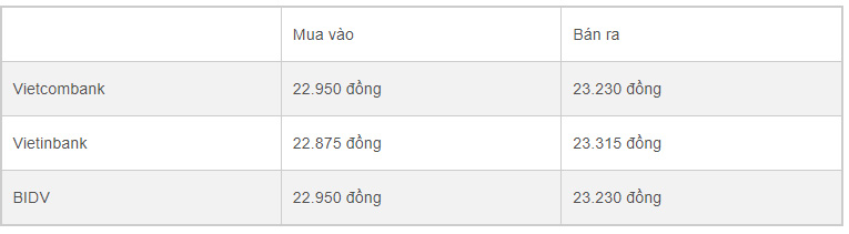 Tỷ giá USD tại các ngân hàng thương mại mua vào và bán ra như sau:Vietcombank: 22,950 đồng - 23,230 đồngVietinBank: 22,875 đồng - 23,315 đồngBIDV: 22,950 đồng - 23,230 đồng
