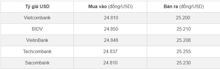 Sacombank cũng đưa giá USD về mức 24.810-25.230 đồng/USD (mua - bán), rẻ hơn 240 đồng ở chiều mua và hạ 270 đồng ở chiều bán.