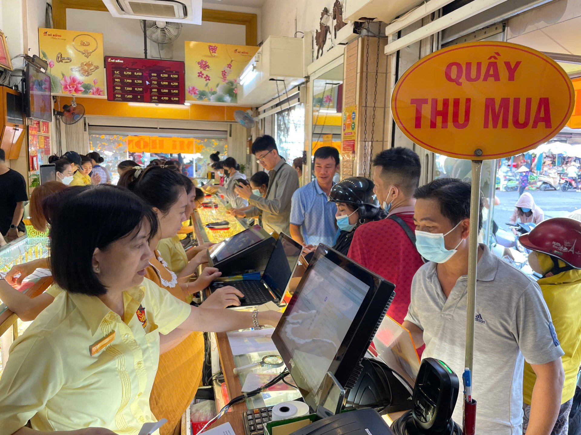 Tại cửa hàng Mi Hồng (quận Bình Thạnh) - thương hiệu vàng nổi tiếng ở TPHCM - nhộn nhịp khách vào ra. Sáng nay, hệ thống cửa hàng vàng Mi Hồng báo giá mua vàng nhẫn trơn 99,99 chỉ có 82 triệu đồng/lượng, còn bán ra ở mức 84,8 triệu.