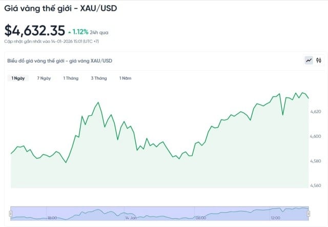 Theo cập nhật mới nhất từ các sàn giao dịch quốc tế, giá vàng thế giới trong phiên 14/1 tiếp tục duy trì xu hướng đi lên và chốt phiên ở vùng giá rất cao. Tính đến khoảng 15h theo giờ Việt Nam, giá vàng thế giới giao ngay dao động quanh ngưỡng 4.632 USD/ounce, tăng hơn 50 USD so với phiên trước đó. Đây được xem là mức tăng đáng chú ý trong bối cảnh thị trường tài chính toàn cầu vẫn tiềm ẩn nhiều biến động.