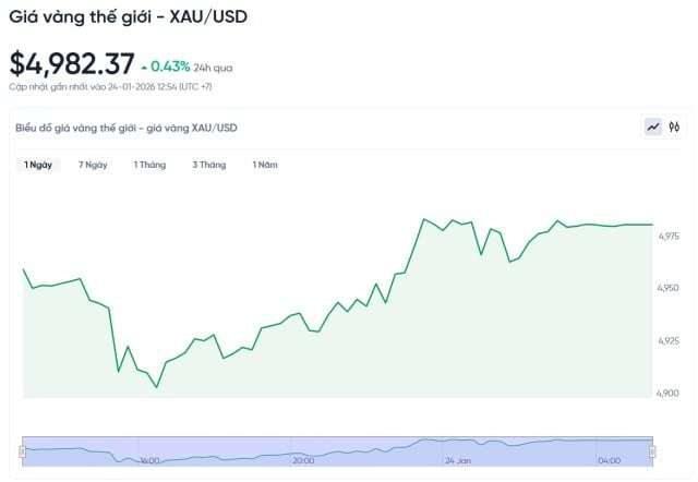 Giá vàng chốt phiên 24/1 cho thấy thị trường kim loại quý quốc tế tiếp tục duy trì xu hướng tăng đáng chú ý. Theo dữ liệu cập nhật vào khoảng 15h cùng ngày, giá vàng thế giới giao ngay được giao dịch quanh ngưỡng 4.982 USD/ounce, tăng hơn 20 USD so với phiên liền trước. Đà đi lên này giúp giá vàng hôm nay trên thị trường quốc tế tiến sát mốc tâm lý 5.000 USD/ounce, mức cao hiếm thấy trong nhiều năm trở lại đây.