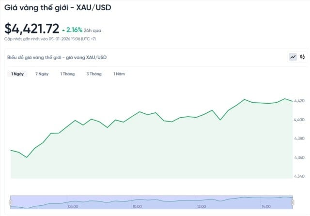 Tính đến 15h30 ngày 5/1/2026 (giờ Việt Nam), giá vàng thế giới giao ngay đạt 4.421,72 USD/ounce, tăng 93,29 USD so với ngày trước đó, theo ghi nhận của Kitco. Quy đổi theo tỷ giá USD tại Vietcombank (26.380 VND/USD), giá vàng thế giới tương đương khoảng 140,56 triệu đồng/lượng, chưa tính thuế, phí. Mức giá này tạo ra chênh lệch vàng so với vàng SJC trong nước lên tới 16,24 triệu đồng/lượng.