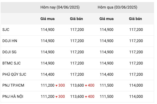 Theo đó, giá vàng miếng SJC được Công ty VBĐQ Sài Gòn SJC niêm yết ở ngưỡng 114,9-117,2 triệu đồng/lượng (mua vào - bán ra), giá không có sự thay đổi cả hai chiều mua vào và bán ra. Tương tự, giá vàng miếng SJC được Tập đoàn DOJI niêm yết ở ngưỡng 114,9-117,2 triệu đồng/lượng (mua vào - bán ra), giá giữ nguyên.
