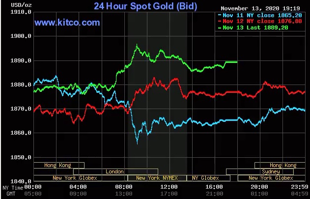 Trên thị trường vàng, giá giao ngay thế giới hôm qua (13/11) tăng hơn 12 USD lên 1.889 USD một ounce. Giá vàng đi lên do số ca nhiễm toàn cầu tiếp tục tăng, một lần nữa dấy lên lo lắng về tác động kinh tế của đại dịch. Nhà đầu tư cũng lo ngại về mức độ tiếp cận của vaccine tiềm năng.