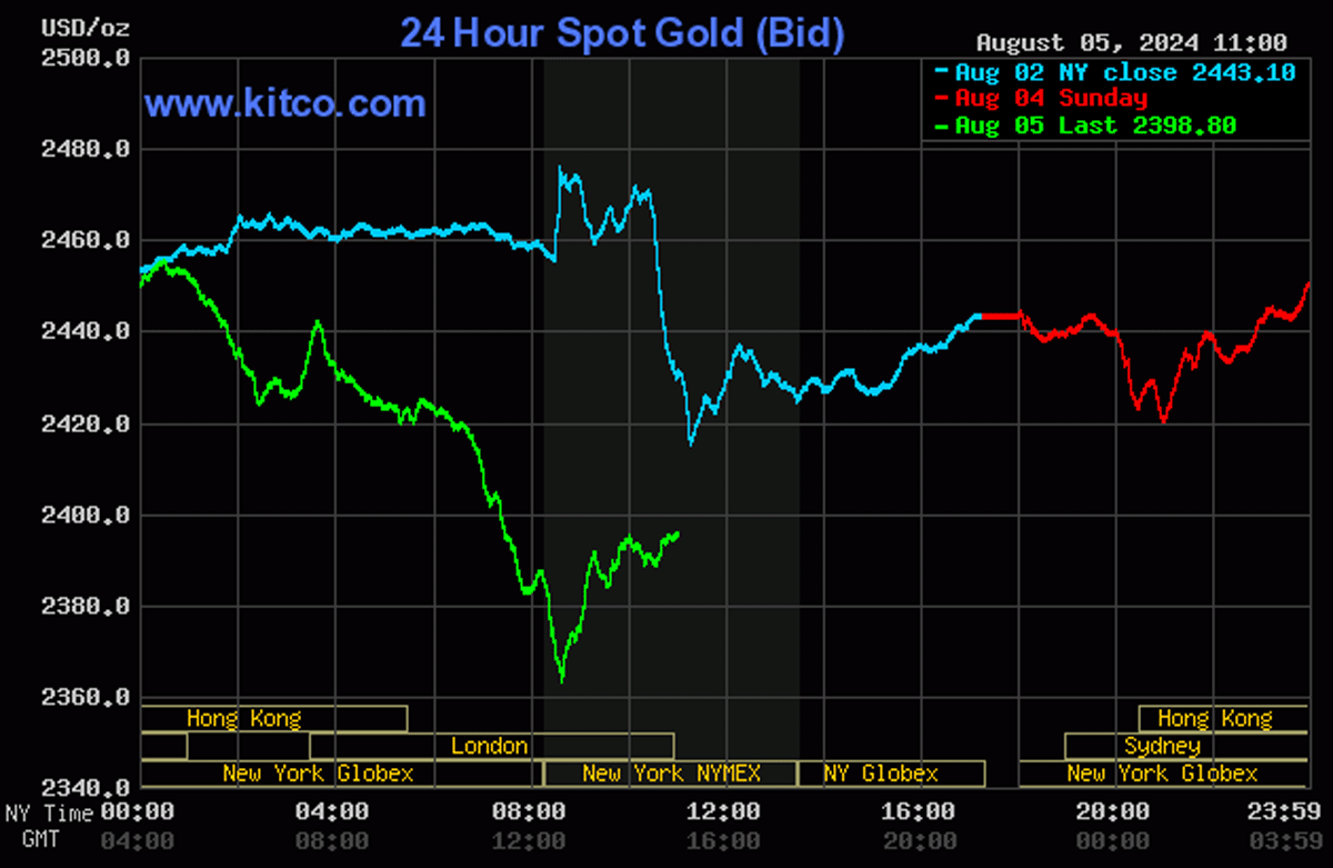 Một điều bất ngờ là giá vàng lao dốc, mất khoảng 90 USD (3%) xuống 2.364 USD/ounce, từ mức 2.454 USD/ounce trước đó.