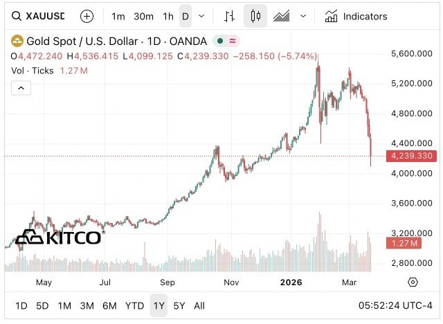 Diễn biến của giá vàng trong nước chịu ảnh hưởng trực tiếp từ xu hướng của vàng thế giới. Theo dữ liệu từ Kitco, giá vàng quốc tế giảm hơn 5,5%, xuống còn khoảng 4.240 USD/ounce. Điều này cho thấy thị trường vàng toàn cầu đang chịu áp lực điều chỉnh sau giai đoạn tăng mạnh trước đó.