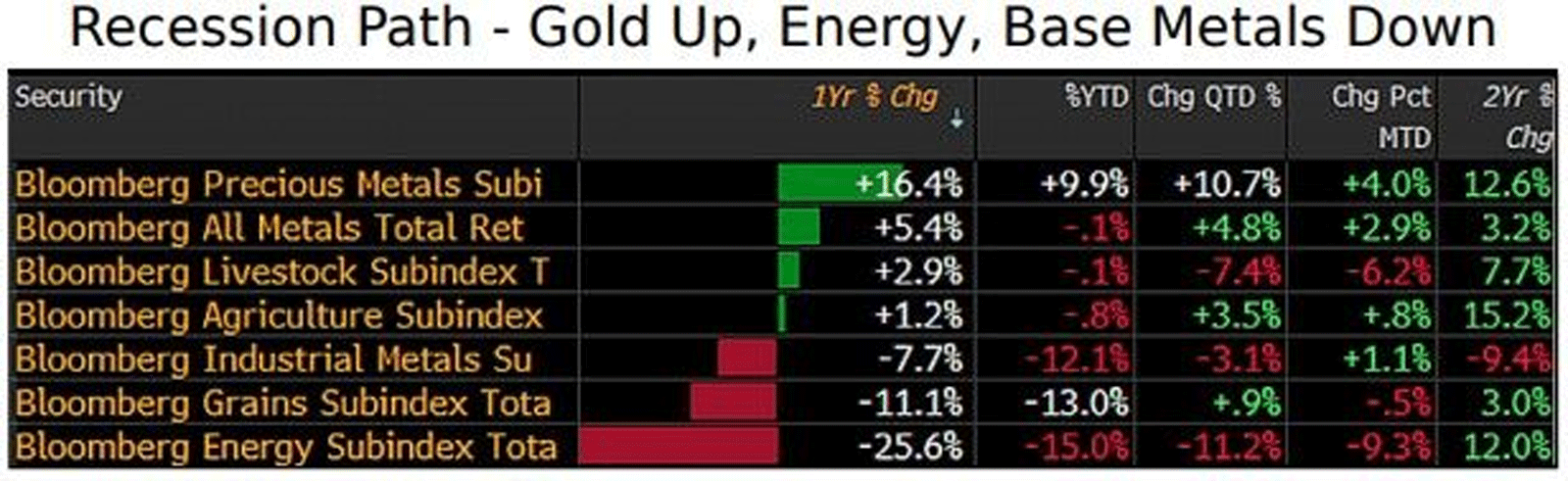 McGlone lưu ý rằng sự xuất hiện của vàng ở đầu danh sách hiệu suất vĩ mô hàng năm của Bloomberg Intelligence trong khi chỉ số hàng hóa giao ngay của Bloomberg ở dưới cùng cho thấy thị trường đang trên đường hướng tới suy thoái kinh tế toàn cầu.