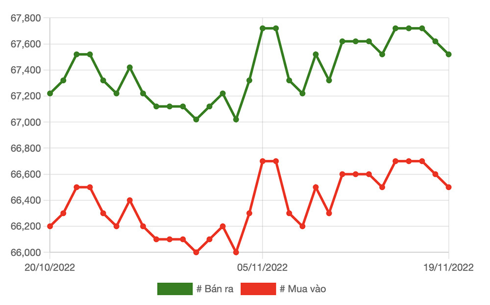 Tới phiên 18/11, giá vàng trong nước giảm 100 nghìn đồng/lượng. SJC niêm yết ở mức 66,6 triệu đồng/lượng (mua vào) - 67,62 triệu đồng/lượng (bán ra). Kết thúc phiên 19/11, giá vàng miếng 9999 tại SJC TP.HCM là 66,5 triệu đồng/lượng (mua vào) - 67,5 triệu đồng/lượng (bán ra). SJC Hà Nội niêm yết ở mức 66,5 triệu đồng/lượng (mua vào) và 67,52 triệu đồng/lượng (bán ra).