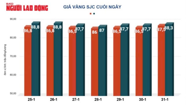 Tại Việt Nam, trong ngày mùng 3 Tết (31-1), một số tiệm vàng bán ra vàng nhẫn với giá 87 triệu đồng/lượng. Giá vàng miếng SJC bán ra 88,3 triệu đồng/lượng.