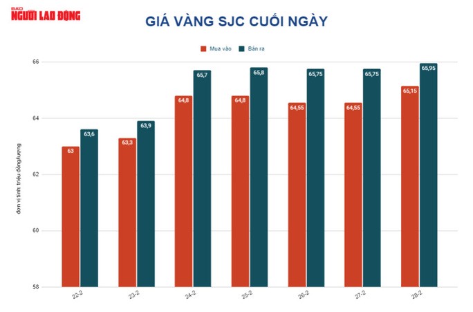 Trước đó tại Việt Nam, thị trường vàng biến động khá sốc. Giá vàng SJC đầu ngày 28-2 tăng 1 triệu đồng/lượng, cán mức 66 triệu đồng/lượng. Thế nhưng, do sức mua yếu nên giá vàng SJC vào cuối ngày xuống còn 65,95 triệu đồng/lượng.