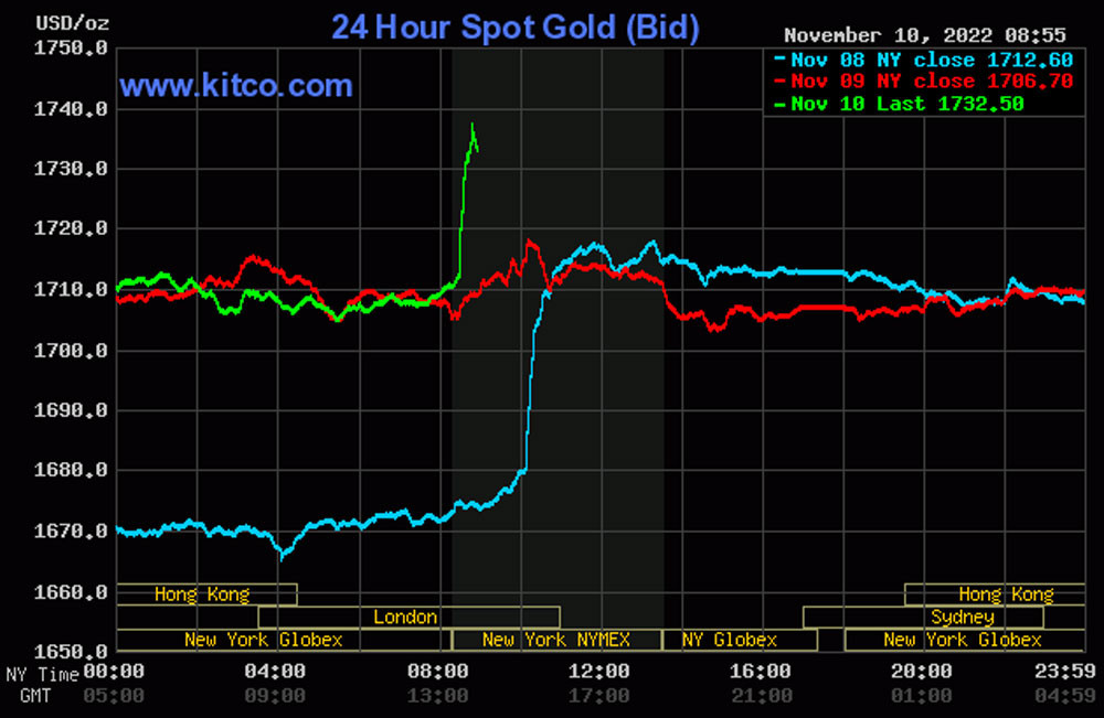 Đêm 10/11 (giờ Việt Nam), giá vàng thế giới giao ngay đứng quanh ngưỡng 1.732 USD/ounce. Vàng giao tháng 12 trên sàn Comex New York ở mức 1.735 USD/ounce.