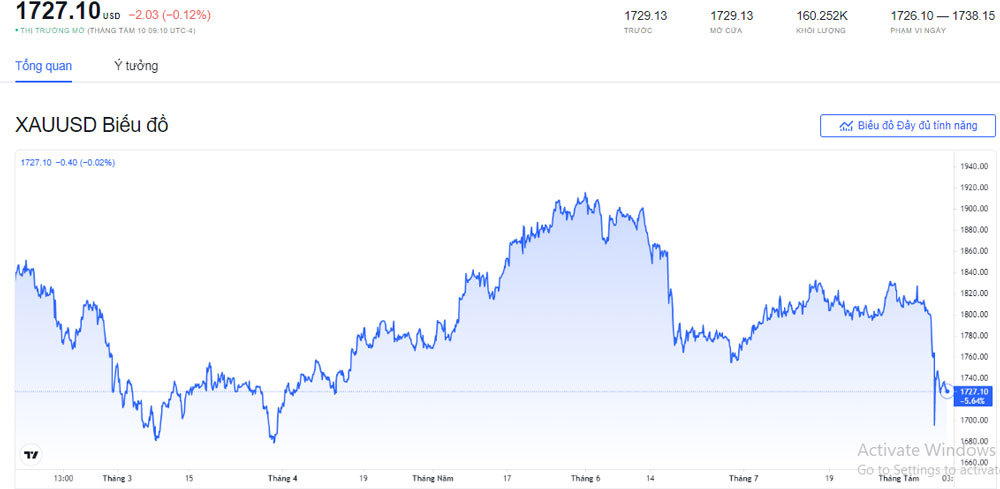 Đêm 10/8 (giờ Việt Nam), giá vàng thế giới giao ngay đứng quanh ngưỡng 1.729 USD/ounce. Vàng giao tháng 12 trên sàn Comex New York ở mức 1.734 USD/ounce.
