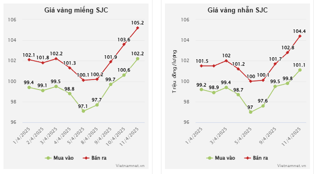 Kết phiên 11/4, giá vàng miếng tại SJC đóng cửa ở mức 102,2-105,2 triệu đồng/lượng (mua vào - bán ra), tăng 1,6 triệu đồng/lượng ở cả hai chiều mua vào - bán ra so với kết phiên hôm trước.