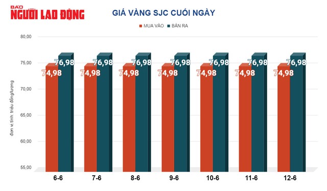 Trước đó, tại Việt Nam, giá vàng miếng SJC trong ngày 12-6 được 4 ngân hàng thương mại (Vietcombank, Agribank, BIDV, VietinBank) và Công ty SJC giữ nguyên ở mức 76,98 triệu đồng/lượng. Người dân tiếp tục xếp hàng giao dịch vàng miếng nhưng sức mua có phần giảm so với nhiều ngày trước.