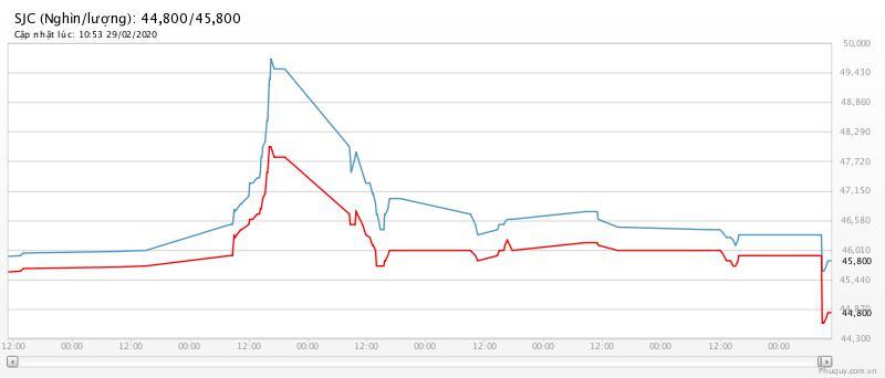 Tiếp các phiên sau đó, giá vàng giao dịch ở ngưỡng 45,8-46,6 triệu đồng/lượng. Ngày 28/2, giá vàng miếng trong nước được Tập Đoàn Vàng bạc đá quý Doji niêm yết ở mức: 46,1 triệu đồng/lượng (mua vào) và 46,40 triệu đồng/lượng (bán ra).