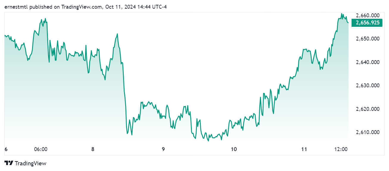 Chốt tuần, giá vàng thế giới giao dịch ở mức 2.656 USD/ounce. Giá vàng kỳ hạn tháng 12/2024 giao dịch ở mức 2.674 USD/ounce.