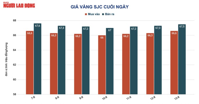 Sáng 14-8, giá vàng SJC được các doanh nghiệp niêm yết mua vào 66,6 triệu đồng/lượng, 67,55 triệu đồng/lượng, tăng 150.000 đồng/lượng so với hôm qua. So với cuối tuần trước, giá vàng SJC không thay đổi.