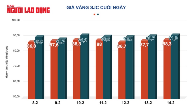 Tại Việt Nam, do trong ngày 14-2, giá vàng thế giới đi lên nên giá vàng SJC cán mức 91,3 triệu đồng/lượng. Giá vàng nhẫn cũng lên tới 91,1 triệu đồng/lượng.