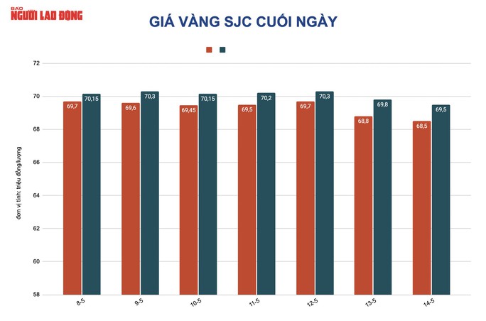 Cuối tuần 15-5, giá vàng SJC tiếp tục được các doanh nghiệp giữ ở mức cao quanh 68,8 triệu đồng/lượng mua vào, 69,7 triệu đồng/lượng bán ra, giảm 750.000 đồng mỗi lượng so với cuối tuần trước.