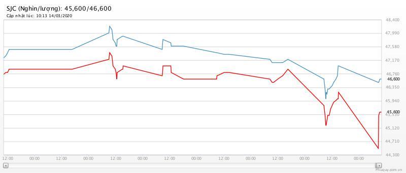 Tiếp các phiên sau đó, giá vàng liên tục giảm. Giá vàng trong nước ngày 13/3 đã giảm tới hơn 1,3 triệu đồng/lượng, sau khi giá vàng thế giới phiên đêm qua chịu tác động từ tâm lý hoảng loạn của giới đầu tư, với việc ồ ạt bán tháo khiến vàng mất gần 60 USD/ounce.